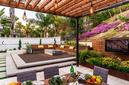 在別墅庭院中,需要設計像矮墻、平臺、廊架、涼亭等構筑物。不同高度、形式的矮墻可以作為座椅的擋墻,一個原木搭建的亭式構筑物、平臺則可以用來觀景或休息之用。